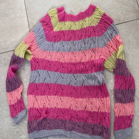 Nystrikket trøje i silkealpaca i eget stribedesign og efter en opskrift str L. 77% alpaca, 23% silke.