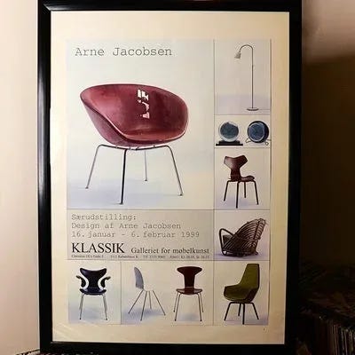 Arne Jacobsen - en særudstillingsplakat fra Finn Dam Rasmussen og Klassik Galleriet for møbelkunst, Christian IX's Gade 5, 1111 KBH K., Offset farvetryk, 1999.
