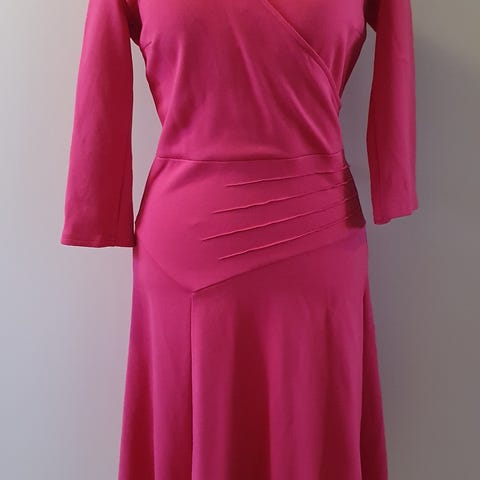 Rund halsudskæring med en oval lille åbning v. bryst og rynkeeffekt i livet, som giver et meget feminint udtryk.