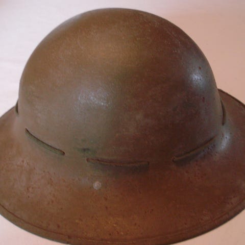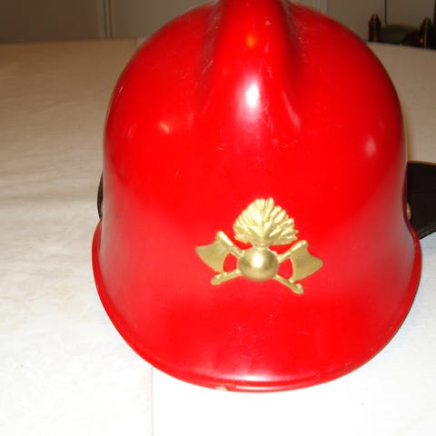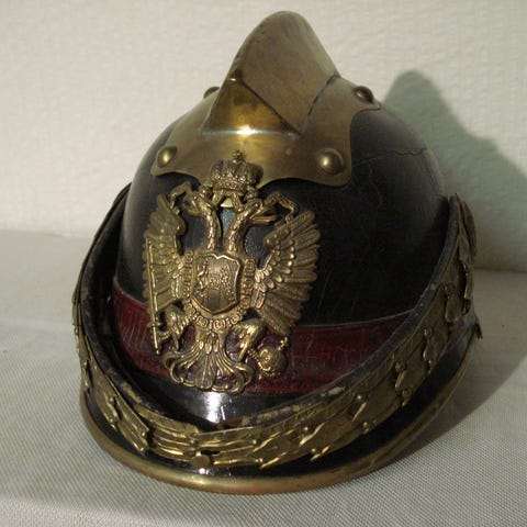 Brandhjelm fra Amsterdam, læder/fiber. Alder formentlig ca. 1920- 30. I meget pæn stand, svag bule i kammen, ellers OK.