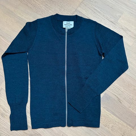 Lækker uldbluse str.12 år. Der er lidt fnulder i ulden enkelte steder. Der er bomuld inderst. Stoffet inderst er mørkt og uld stoffet yderst er lysere grå.