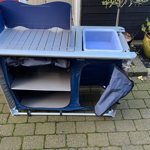 Campingkøkkenet er brugt 1 gang. Det er udstyret med masser af opbevaringsplads og en stor bordplade på 120 cm i alt, så der er masser af plads. Køkkenet er let at stille op og let at pakke sammen i den medfølgende taske.