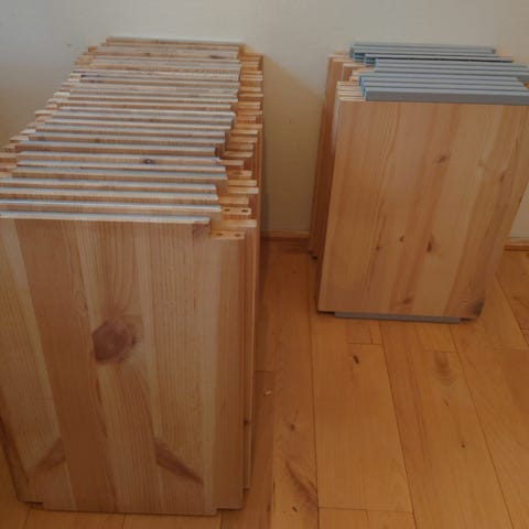 Der medfølger tapper til alle hylder samt en del kryds ..nok til at kunne sætte alle reoler op hvis man vil lave en LP forretning. . Alle 30 cm hylder og stiger kommer fra flere steder de ser dog OK ud alle sammen. Alle 11 stiger er sortmalede dog i lidt varierende toner ..det er nemt at male dem.