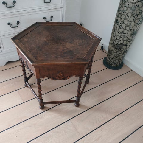 Fint gammelt 6 kantet sofabord, ved ikke hvad det er lavet af, bordplade trænger til slibning/lak eller hvad man nu gør har ikke så meget forstand på træ 🫣
