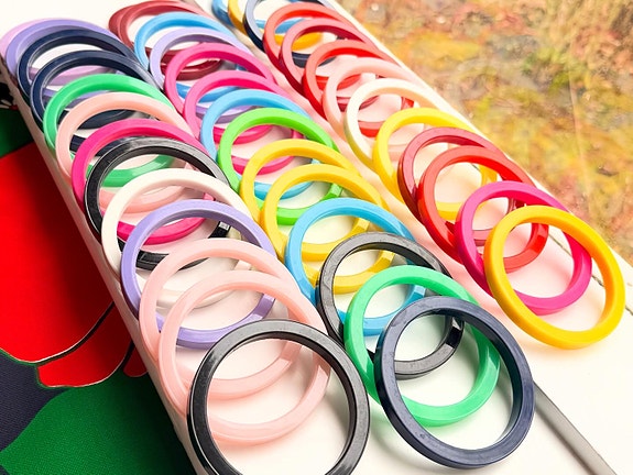 Vintage cirkler med et lille øje til fx øreringe. Støbt i lilla plastik. Flade på bagsiden, men kan limes sammen to og to, så de bliver rundere. Dia 3,9 cm. Fra et smykkelager fra 70’erne, som jeg har købt. Har et lille støbemærke på kanten.