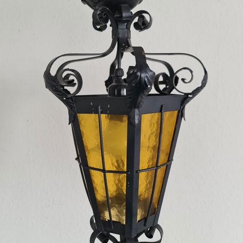 Fin Retro lampe smedejern med glaskuppel, nederst på lampen er der et flot motiv af engle i rød/gul måske af keramik? Den er ihvertfald 50-60år gl. der er en meget kort ledning i 50 cm, så er der lidt rust på smedejernet, fungerer fint.