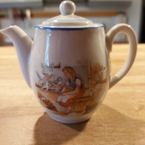 Dukketilbehør, KPM Rubens - Kjøbenhavns Porcelains Maleri, Dukkestel KPM Rubens - Dukkeservice kaffestel / testel fra Københavns Porcelæns Maleri. Antik, 100 år gammelt. Eventyr motiver. I alt 11 dele, en kande med låg, en sukkerskål med låg, fem underkopper, to kopper. Meget sjældent udbudt til salg. Du kan også se stellet på Nationalmuseet. Stellet er i usædvanlig fin stand. Låget til sukkerskålen har en meget lille afslag, som ikke ses, når låget er på sukkerskålen (se foto).