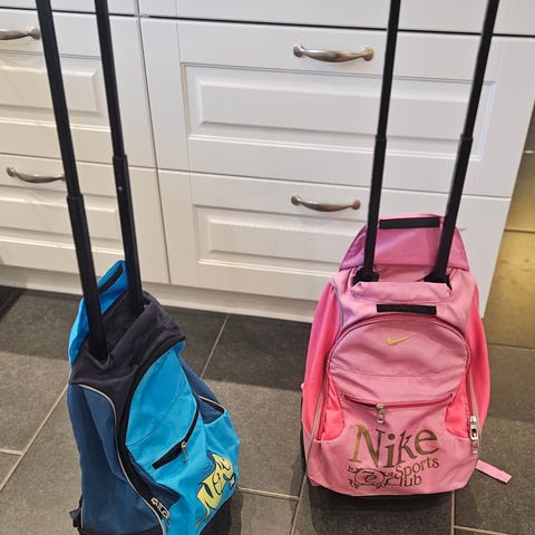 Kan sendes. Perfekt trolley/rejserygsæk til børn i for eksempel fly (passer til under sædet). Den er med hjul, som er rart, når man skal gennem lufthavnen. Et stort rum, et forrum, et siderum til for eksempel mobiltelefon eller snacks og et siderum til dunk.