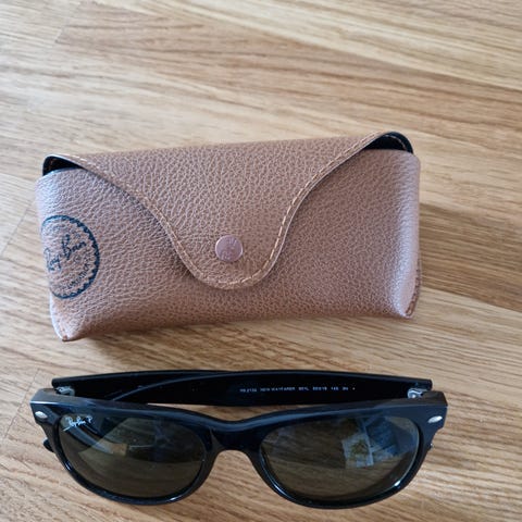 Sorte Ray-Ban New Wayfarer solbriller. Næsten ikke brugt, da de blev købt i en forkert størrelse. Kommer med original emballage (æske), original etui, original pudseklud, og bonen har jeg også. De blev købt i 2022 og har ligget i en skuffe lige siden. Nypris: 979,-