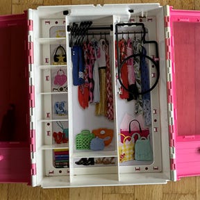 Barbie, Barbie klædeskab, Super fint Barbie klædeskab. Der er plads til masser af barbiekjoler i skabet. Man kan trække den sorte ring ud, så man kan hænge kjolerne på den. Super nem at tage med sig.