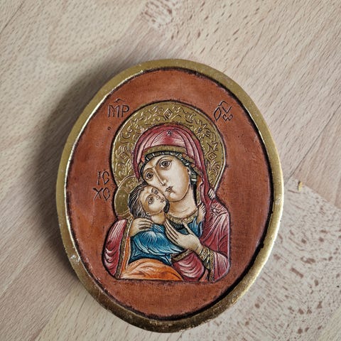 Ikoner fra et kloster i Rumænien. Jeg købte dem for snart mange år siden i Rumænien. Der fulgte papirer med som jeg desværre ikke kan finde. De skulle være malet på over 300 år gammelt træ fra selvsamme kloster (Kan ikke huske hvilket heller).