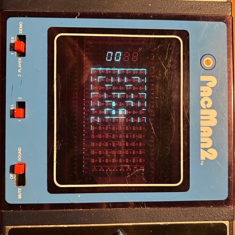 Retro Pacman fra 80'erne man kan spille en eller to spiller, bruger 4 stk c batterier og alt virker og god lyd.