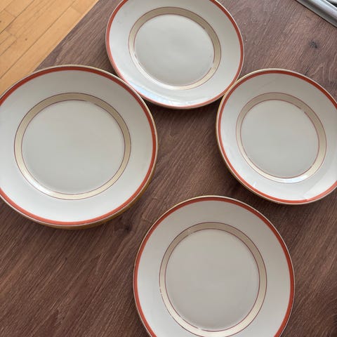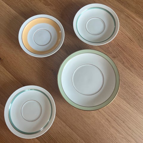 Alle fire tallerkner er brugt men i god stand. Eneste brugsspor er et skår i den ene tallerken.