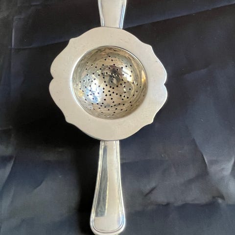 Eksklusiv art deco tesi i sølv med bølget kant og med vifteformet afslutning i lakeret træ/ibenholt på håndtaget.