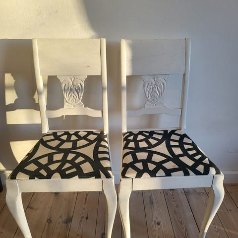 2 stk. hvidmalet i egetræ. Den ene stol skal limes, hvor sædet er sat på ryggen, men er ikke i stykker! Sædehøjde er 46 cm.