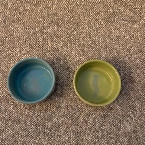 Kanin keramik mad skål i lilla. Har fået slået nogle flier af som kan ses på billedet. Det er de hvide pletter hvor der er slået skår af.