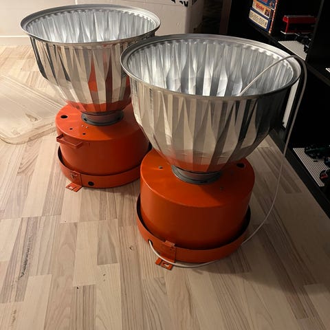 Industri loft lampe fra ASEA SCANDIA Stor lampe med E27 fatning og reflektor skærm i aluminium. Ø53 og ca. 60 cm høj. Lampen har et stort orange "hoved", som er med til at understøtte det rustikke look fra de gamle fabrikshaller. Lamperne er i fin stand, og har flot patinering. Nogle af reflektorskærmene kan have buler og skrammer. (se billeder). Lampens orange "hoved" kan ligeledes have buler og skrammer. (se billeder).