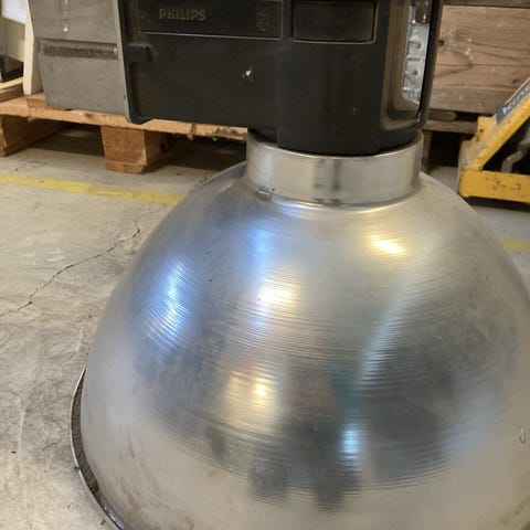 Industri lampe Philips HDK 250 IC Stor lampe med E27 fatning og reflektor skærm i aluminium. Ø53 og ca. 46cm høj. Lampen har et stort sort "hoved", som er med til at understøtte det rustikke look fra de gamle fabrikshaller. Lamperne er i fin stand, og har flot patinering. Nogle af reflektorskærmene kan have buler og skrammer. (se billeder). Lampens "hoved" kan ligeledes have buler og skrammer. (se billeder).