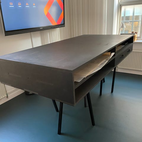 Brugt konferencebord med 8 stole. Bordet er sort, mål: 300x130x103 cm. Er skilt ad. Se billederne, lamperne medfølger ikke. Stolene er stabelbar 40/4 barstol designet af David Rowland. Der er 3 grå og 5 røde stole med trevira stof. Mål: 48x50x107 cm. Sædehøjde: 78 cm.