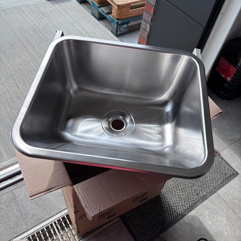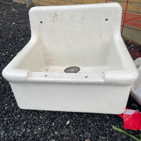 Udslagsvask med overløb, uden hanehul. Vasken fremstår med patina og brugsspor. Vasken fås i flere forskellige breddemål, vi har bl.a. 57,5x47x18cm. vælg størrelse under varianter. Vasken kommer fra Aarhus kommunehospital. https://kingogenbrug.biz/vare/udslagsvask-45x60cm