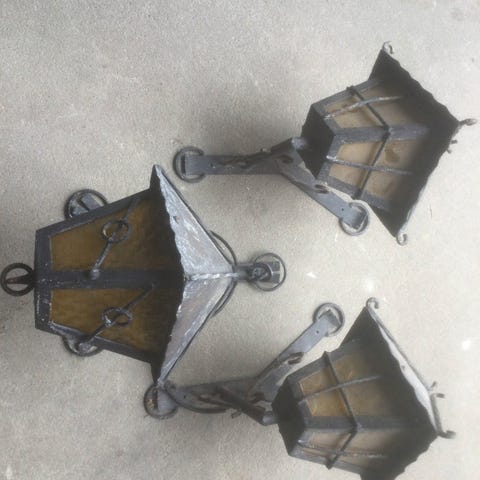 Herregårds Smedejerns væglampe med kobber "hat" og blæst glas med "bobler". Lampen har en virkeligt flot patina, og smedejernet har lidt rust flager, men er ellers i rigtig flot stand. Det er en kæmpestor lampe på 170cm fra bunden af smedejernet til spidsen af hatten, som har en diameter på ca. 45cm. Lampen rækker 77cm ud fra vægen. Mål: 77x45x170cm. Denne vare skal afhentes fra vores lager, eller special transport skal aftales.