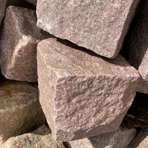 Chaussesten rød/grå mix 8-11cm. Parti med sten i røde og grå farver, som giver et flot farvespil i belægningen. Stenene kan varierer i størrelse, og kan være uregelmæssige. Der går ca. 10 stk. pr løbende meter. Hver sten vejer ca. 2-2,5kg. Sælges pr. stk.