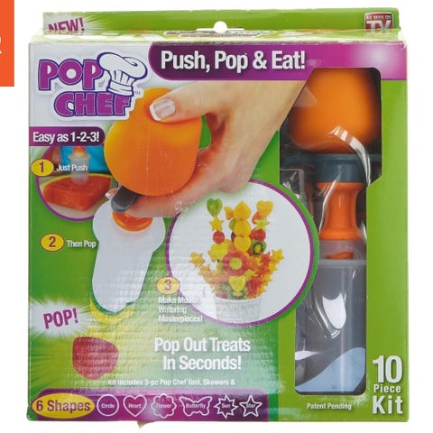 Komplet Pop Chef sæt til madlavning. Man kan fx skære frugt og grønt ud i former. Lave tapas snacks o lign. Dansk og andre sprogs idekatalog med masser af billeder og anvisninger medfølger. Sender gerne.