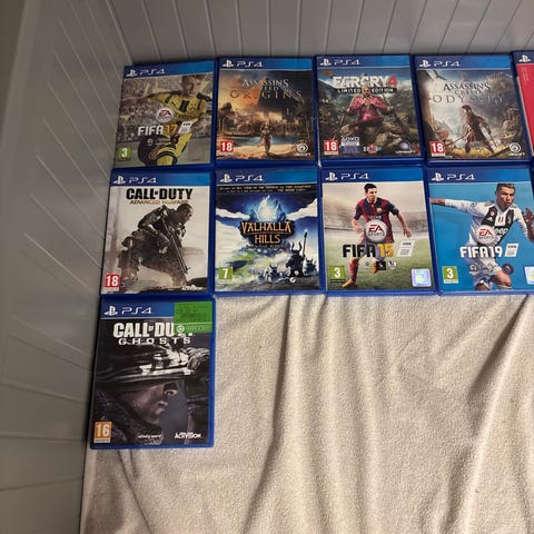 Playstation 4 spil samling med forskellige titler, herunder populære spil som FIFA-serien, Red Dead Redemption II, Marvel's Spider-Man, og Ghost Recon Breakpoint. Perfekt til fans af sport, action og eventyrspil.