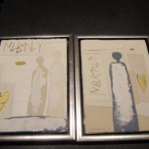 Tre små billeder af børn, tegnet af Arnulf Stegmann, der var lam efter polio og derfor lærte sig at male med munden. Billederne er eksempler på hans postkort, her indrammet i små, sorte rammer bag glas.