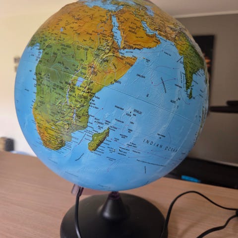Flot globus i stål og plast fra dk MENY - design Jakob Wagner - aldrig taget i brug. Globussen kan ophænges og fastgøres magnetisk. Dvs. kan tages ned til nærmere studier.
