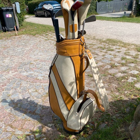 Original retro PING Karsten lll golfsæt selges. Komplet vintage golfsæt med ikoniske PING Karsten III køller samt Spalding og Prosimmon jern. Golfbag i retro stil med læderdetaljer. Perfekt til brug, samlere, vintage elskere eller som dekoration. Standen er brugt men god – alt fungerer.