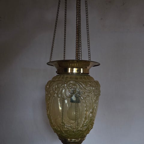 Lampe metal fra 1914, hængt i hall. Er fremstillet af metal, kobber, messing eller andet materiale, samt råglas på de 4 sider.