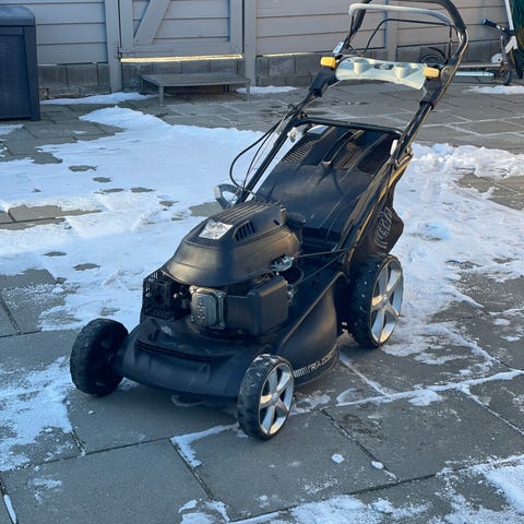 plæneklipperen som ikke er flot, men starter og kører som den skal.