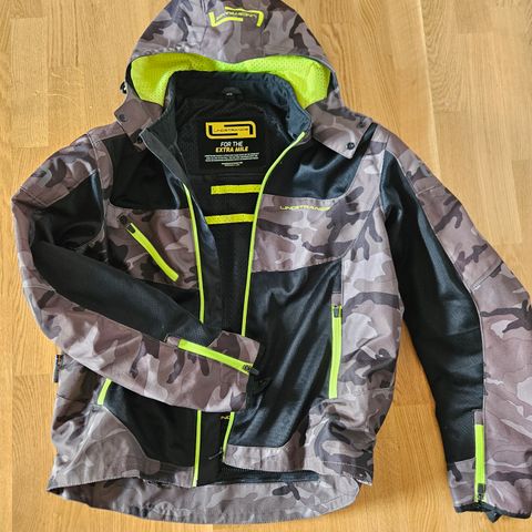 Lindstrands jakke i camouflage mønster med sort og grønne detaljer. Designet til herrer, denne jakke tilbyder både stil og funktionalitet. Den har flere lommer og en neon grøn inderside for ekstra synlighed. Ideel mc turen. Inderforet kan lynes af. Modtager mobilepay eller kontant. Varen kan sendes for købers regning. Str. 62