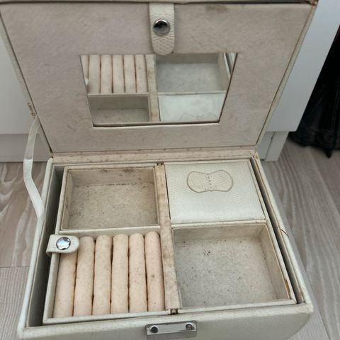 2 - retro smykkeskrin af læder med spejl og flere afdelinger. Brun/ beige. Nøgle. Fin stand. H 10,7 cm, L 14 cm, B 14 cm.