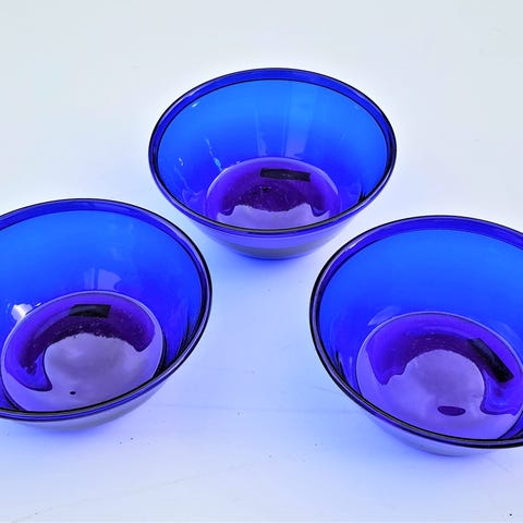 mælkeskåle blæst i koboltblå glas med omlagt rand og svag opstukken bund med anhæftning.