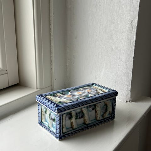 Fineste dekorerede låg (fra tidligere lågskrin) med smuk dekor i blå amedansigt / kvinde og blomster. Fra Artistic Seito, Made in Japan.