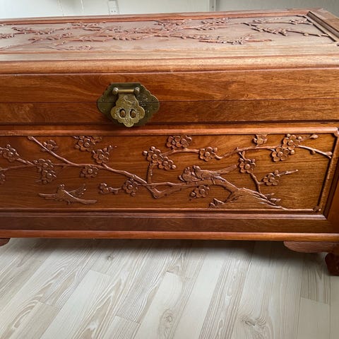 Antik kiste i træ grøn med dekoration. Kisten har et rummeligt interiør og er udsmykket med blomsterdesign. Perfekt til opbevaring eller som dekorativt element i hjemmet. Flot stand, og med nøgle så den kan låses. B120cm D60cm H65cm