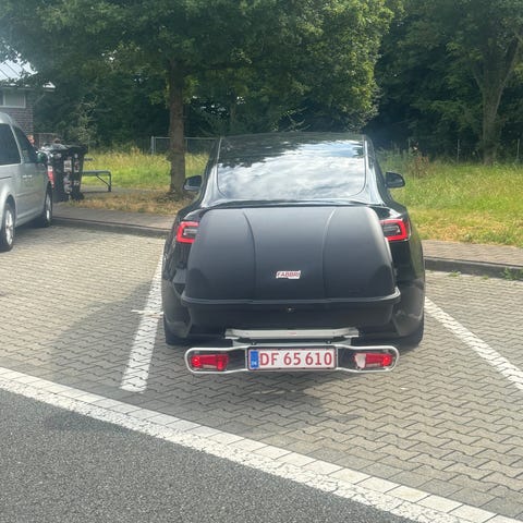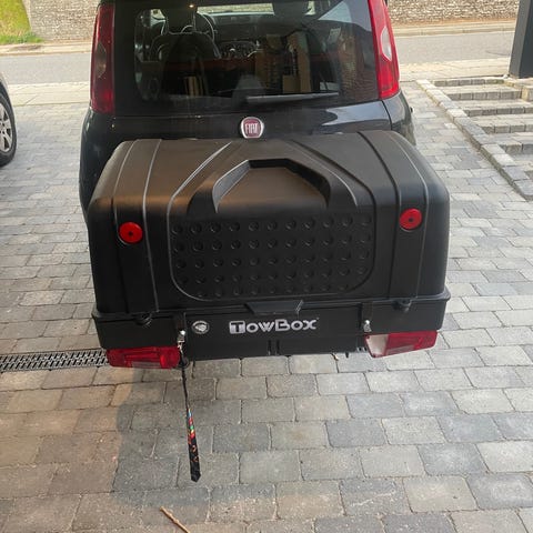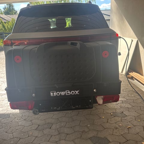Bagageboks til anhængertræk, 410 liter. Let at montere og kan tippes så man stadig kan tilgå bagagerummet.