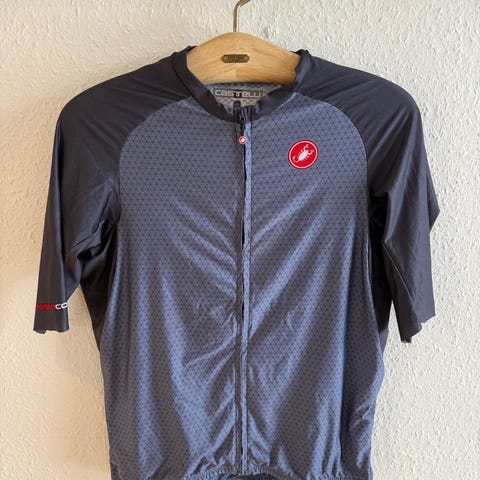 Castelli espresso cykeltrøje i størrelse small. Jeg er 183 og vejer 72 kg og den passer temmelig godt. Nypris 900 og den er udsolgt mange steder i størrelsen, så en rimelig besparelse her.