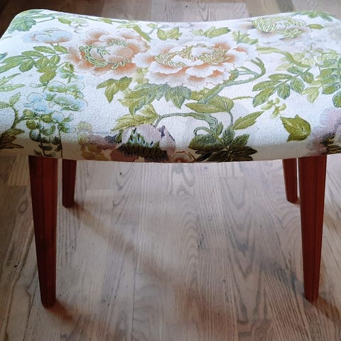 Skammel (sort kunstlæder…) med sybord gemt i, med teaktræs ben.