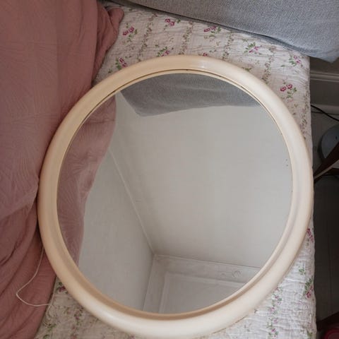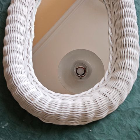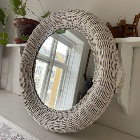 Spejlet er ovalt / aflangt. Jeg sælger også et rundt spejl i flet - begge for 450kr.
