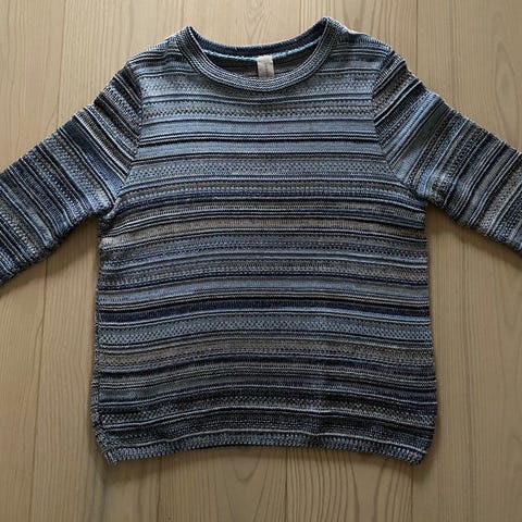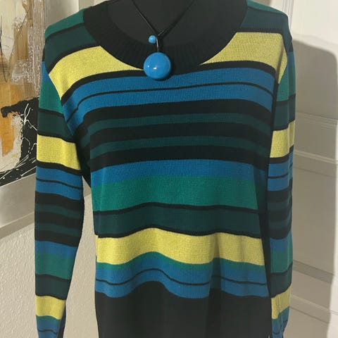 Grøn striktrøje fra Skovhus med et unikt mønster på den nederste del og en stribe i midten. Trøjen har lange ærmer og en behagelig pasform.
