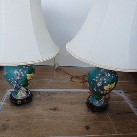 Kinesiske vintage keramiske bordlamper med detaljeret blomstermønster. Lampens krop er lavet af hvid keramik dekoreret med farverige blomster og traditionelle motiver. Hver lampe har en messingfarvet sokkel og kommer med en hvid lampeskærm. Velegnet til brug i stuer eller soveværelser for at tilføje et klassisk og dekorativt element. Den ene lampe måler: Højde 30 (56) cm - Højde med skærm 64,5 cm - Diameter ca. 14 cm. Den anden lampe måler: 29 (55) cm - Højde med skærm 63,5 cm - Diameter ca. 14 cm. Køb dem samlet for kr. 800,00 eller pr. stk. kr. 500,00