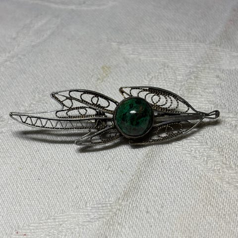 Brochen er formet som 2 stilistiske blade og er i sterling sølv- stemplet Sterling B&L.
