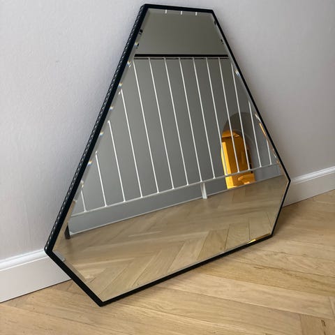 Sekskantet spejl fra Novel Cabinet Makers med mørkegrøn perforeret ramme. Måler 70x144 cm. Kan både hænge horisontalt og vertikalt. Nypris 4000 kr.