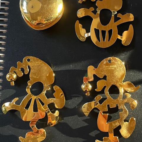 Snefnug, 15 + 6 x ophæng, 2 x fyrfads, 2 x 2 hjerter og kræmmerhus m.v. samt Holmegaard glasklokke (lille)