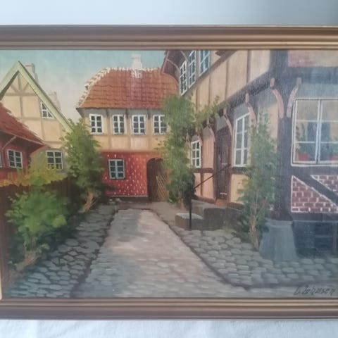 Oliemaleri med motiv fra Holkegade i Faaborg, Den Gamle Gaard og Smedehusene. 1973