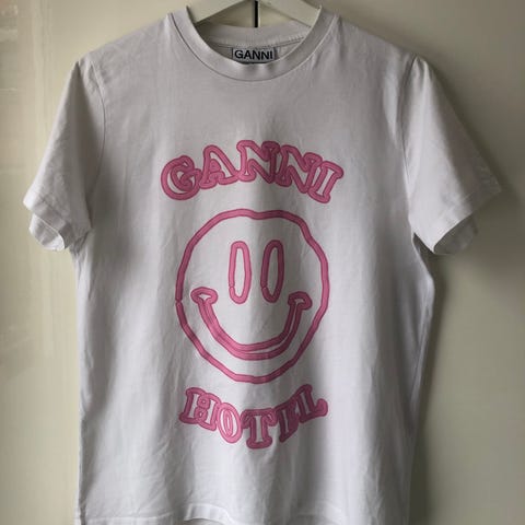Ganni tee, Happy Endings. Sat som brugt pga et par bitte skygger, men i rigtig pæn stand.