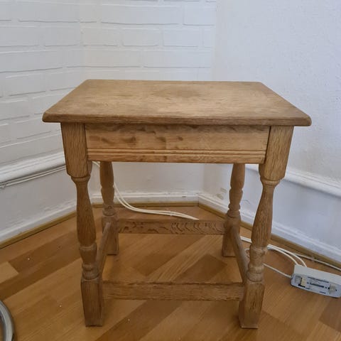 Bordet har en skuffe og fremstår med naturlige brugsspor på bordpladen, som giver fin patina.